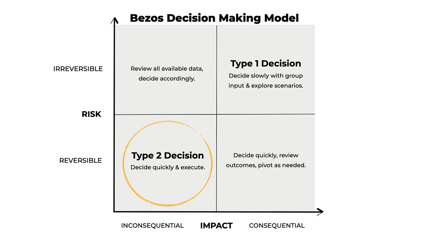 Type 1 Decisions (one-way doors) are characterised by an irreversible, massively consequential impact which require a ton of deliberation, careful decision-making and input from all the experts in your life. Type 2 Decisions (two-way doors) are the opposite, with relatively inconsequently impact and easily reversible should you make the wrong choice, and as such decisions ought to made quickly to find out whether something works or doesn’t.